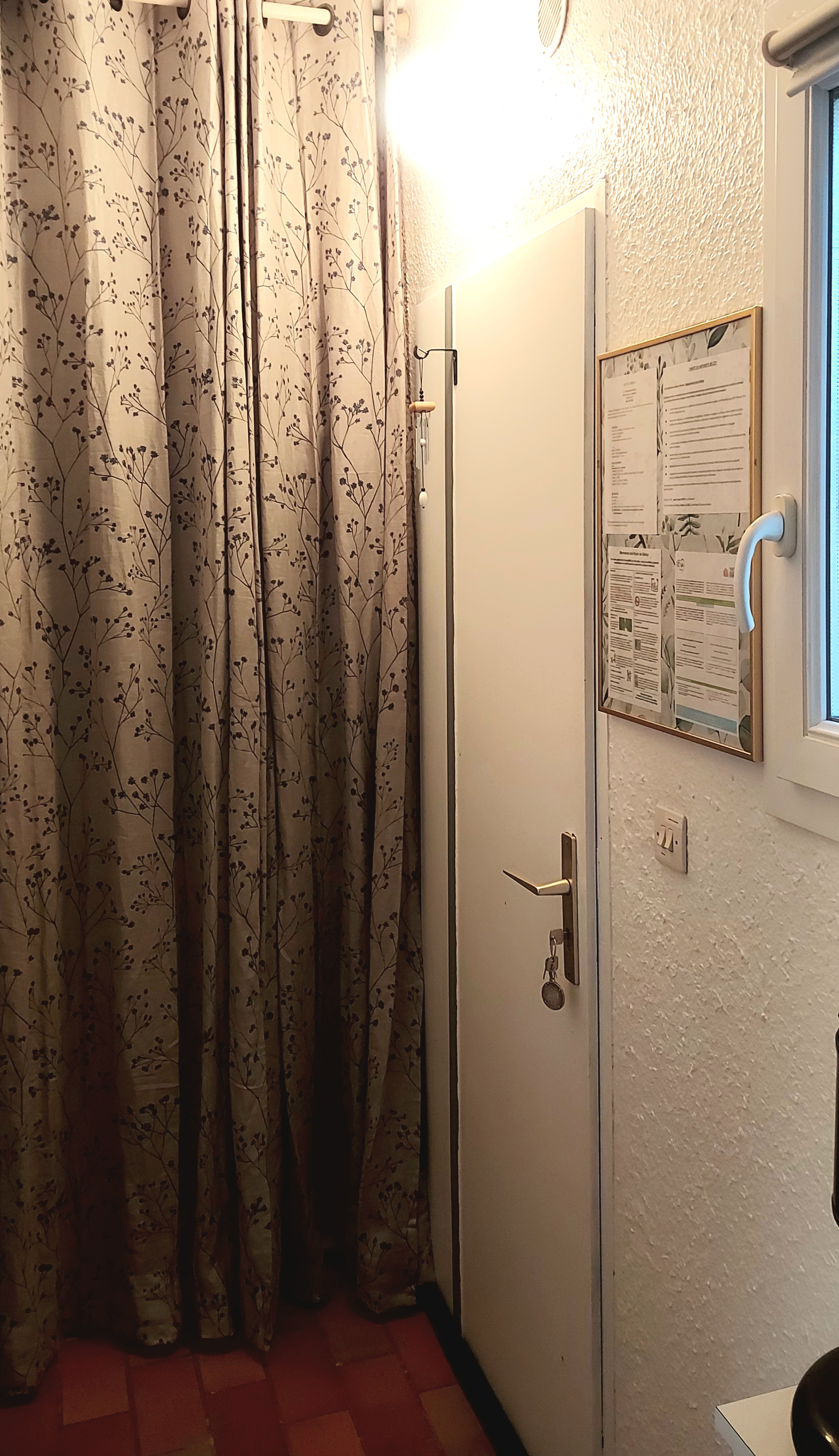 Ajout de 2 fauteuils transats, ajout d'1 parasol pour le solarium, aménagement de la penderie de l'entrée, aménagement d'un caisson ouvert dans le foyer de la cheminée, ajout d'un rideau occultant sur la fenêtre de l’entrée, changement du luminaire au dessus de l'évier, mis moustiquaire à la fenêtre de la salle d'eau, aménagement d'un coin zen sur le solarium, mis en place d'un brise-vue à l'extérieur.